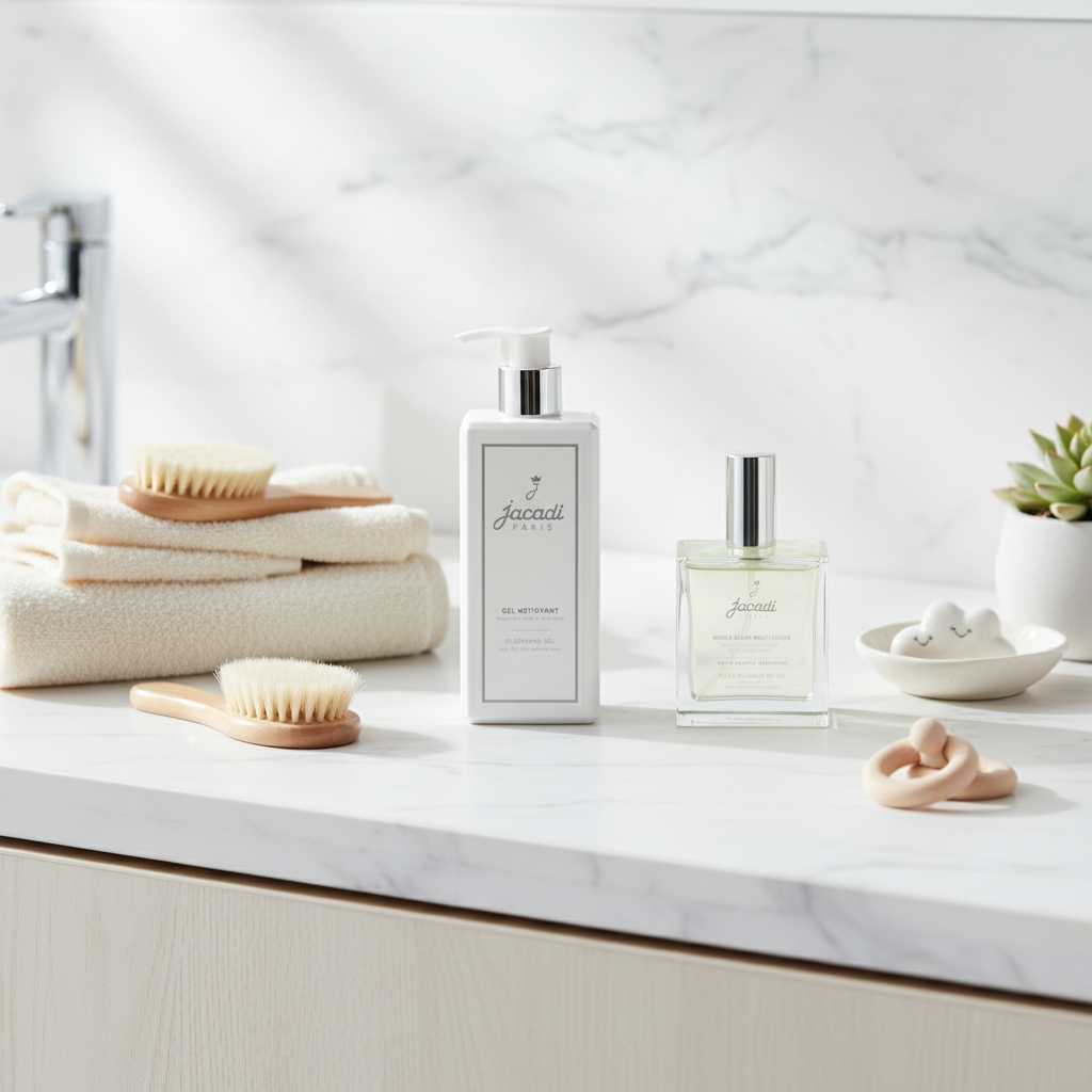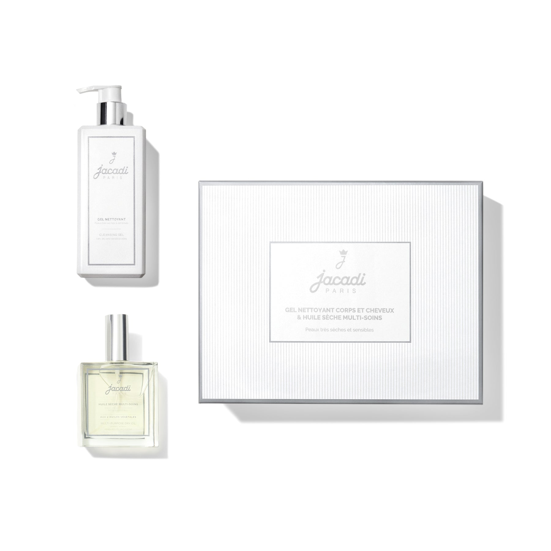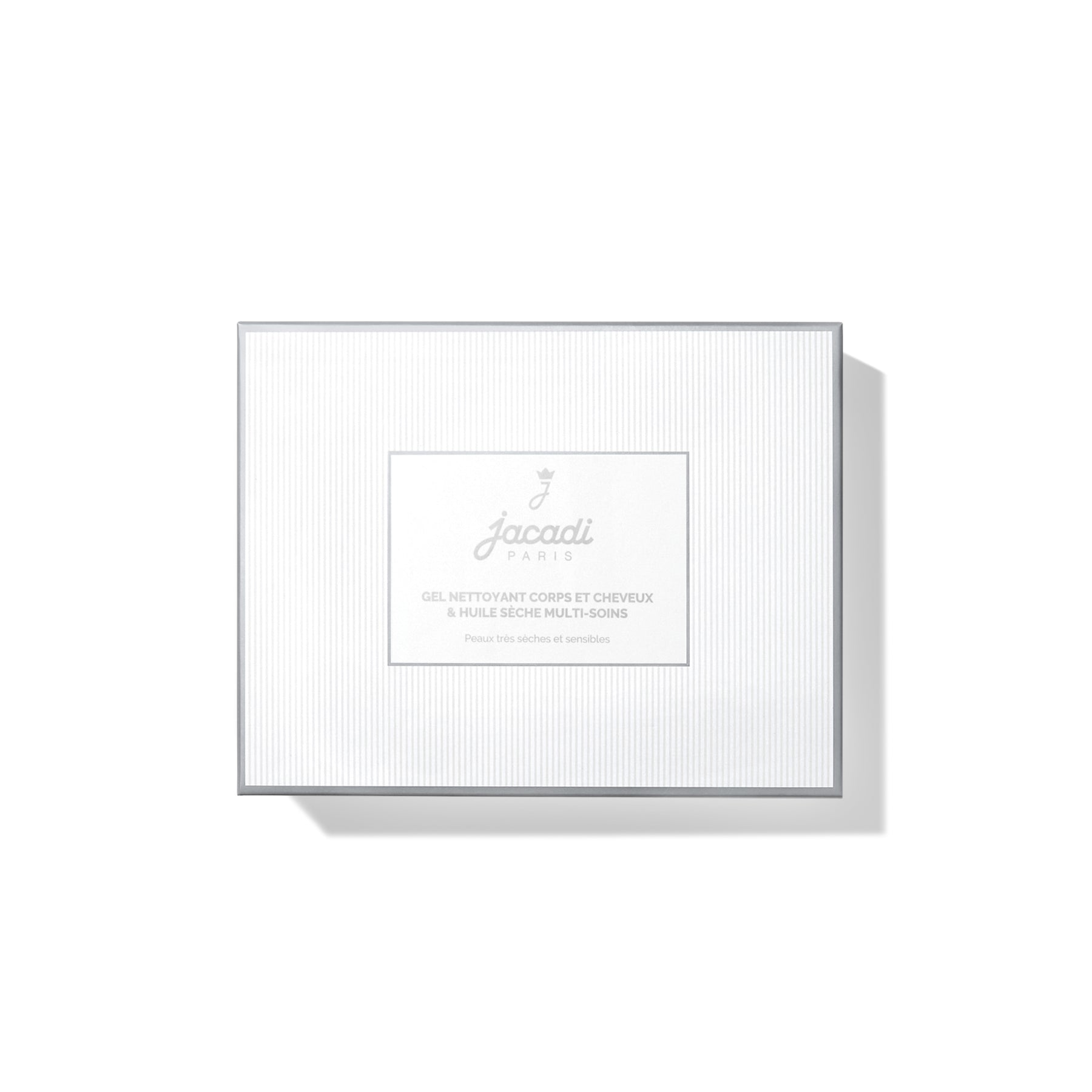 Jacadi has developed a range of skin-friendly skincare products for sensitive skin to pamper the whole family. Gathered in an elegant box, you will discover the cleansing gel and dry oil for moments of sensory well-being.