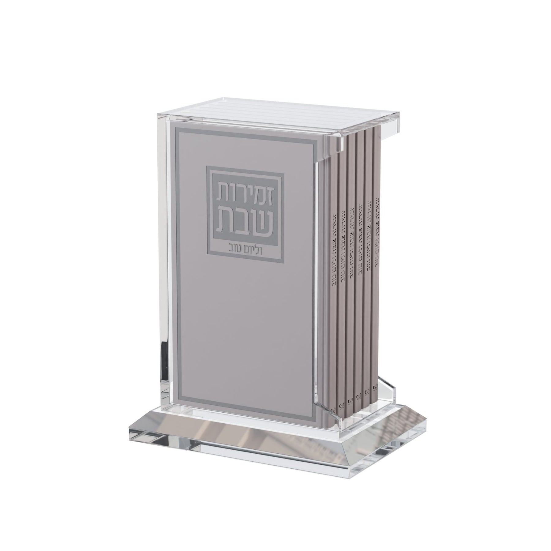 Elevate your Shabbos or Yom Tov table with this exquisite Leather & Lucite Zemiros Set. Featuring crisp, bold lettering beautifully printed and protected by a sleek, easy-to-clean hardcover leather cover, it combines style and durability. Housed in a chic lucite holder with a rotating swivel base, the set remains pristine and ready for use. This Zemiros collection adds a sophisticated touch to your table decor or makes an exquisite gift.