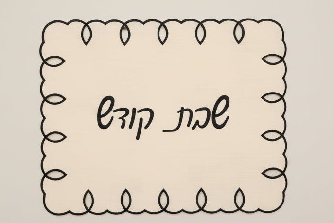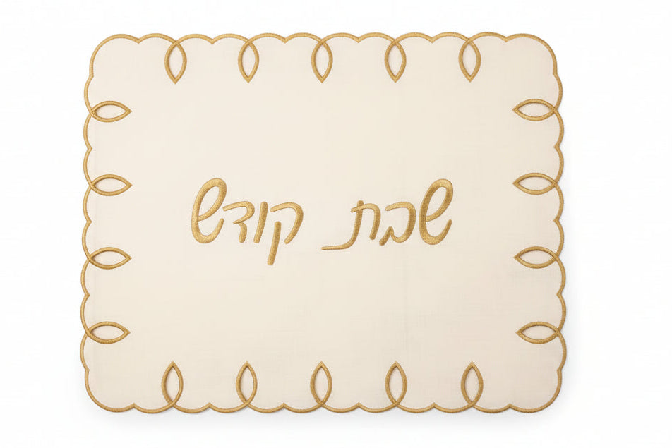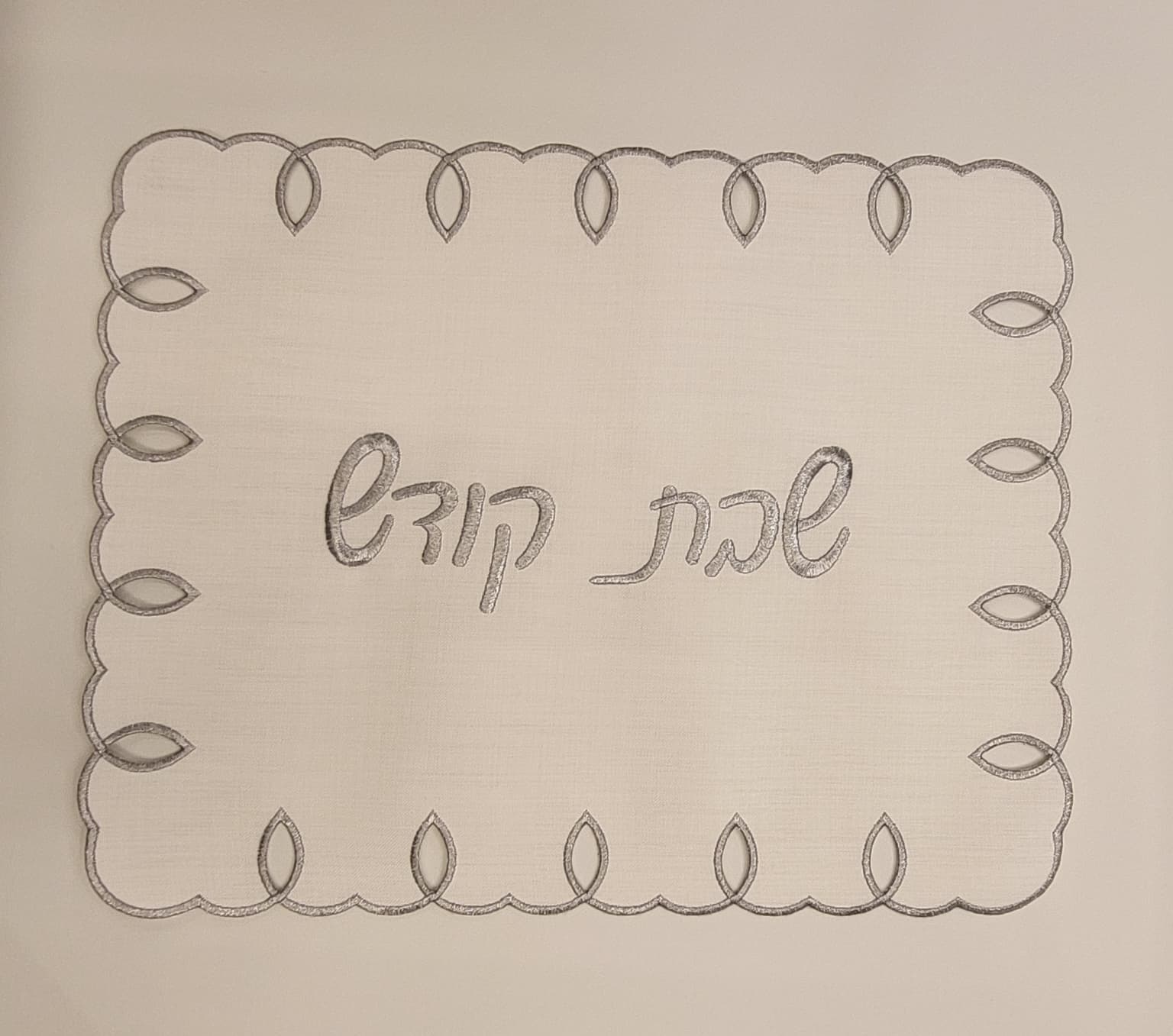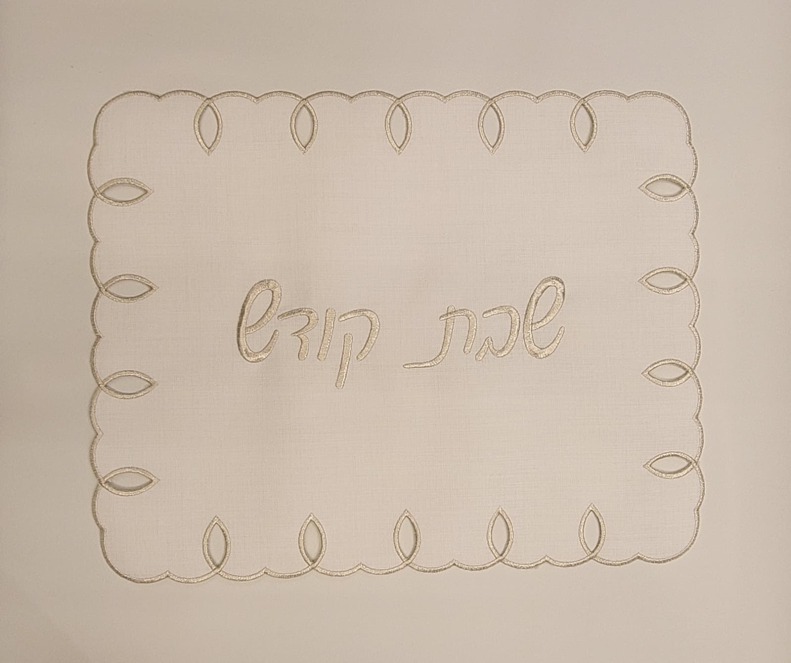 Elevate your Shabbat table with this sophisticated challah cover, crafted from premium linen-look fabric that combines durability with refined elegance. The delicate scalloped edges add a graceful finishing touch, while intricate embroidery detailing showcases artisanal craftsmanship. Perfect for weekly observance or holiday gatherings, this cover protects your challah while making a distinguished statement. The quality construction ensures lasting beauty through countless celebrations, making it an essential addition to your table linens collection.