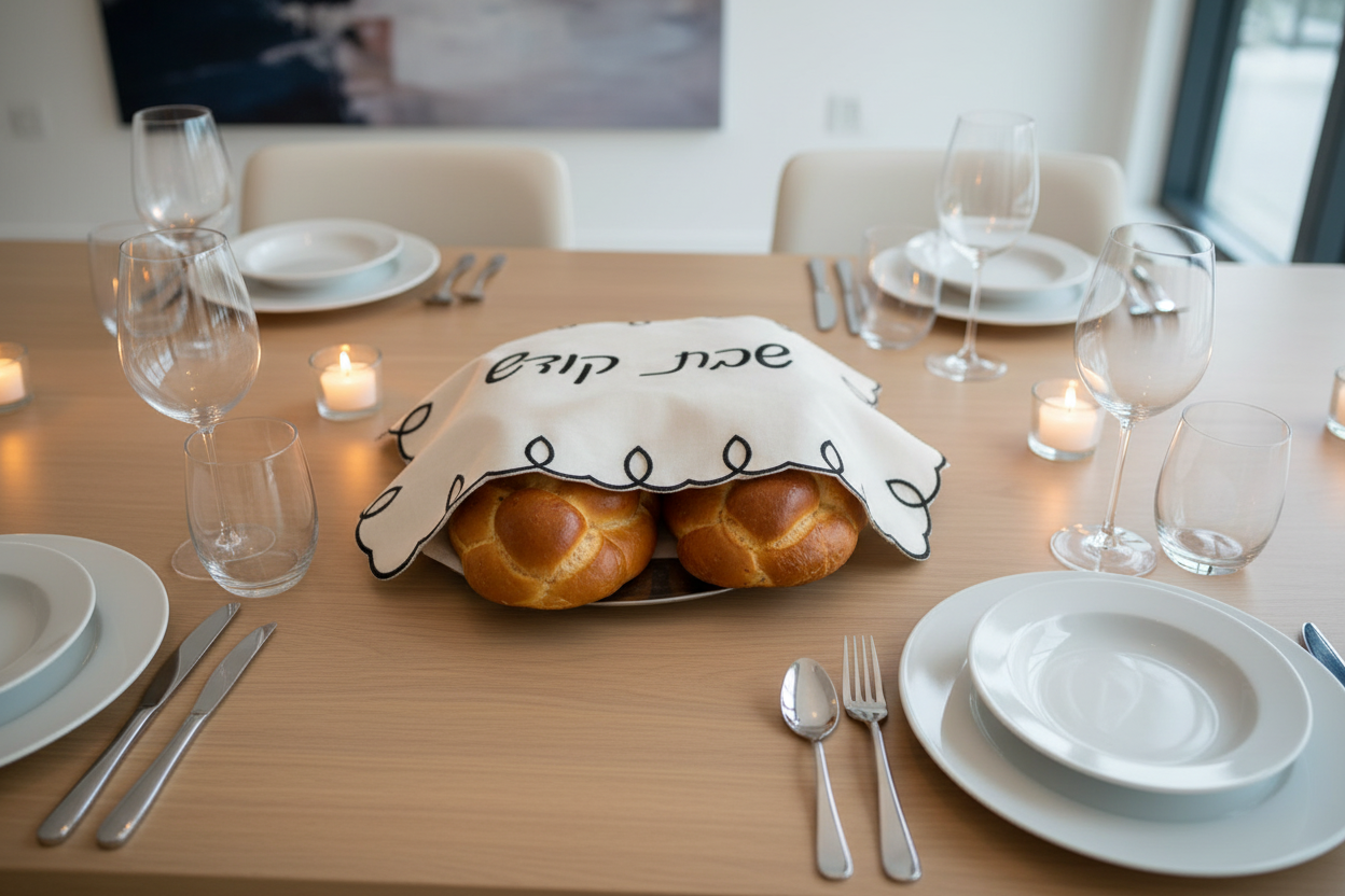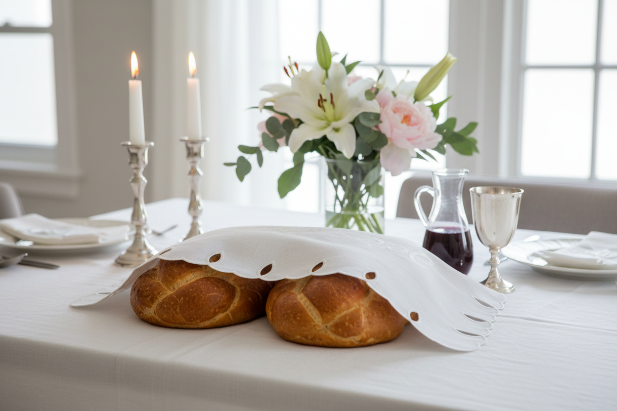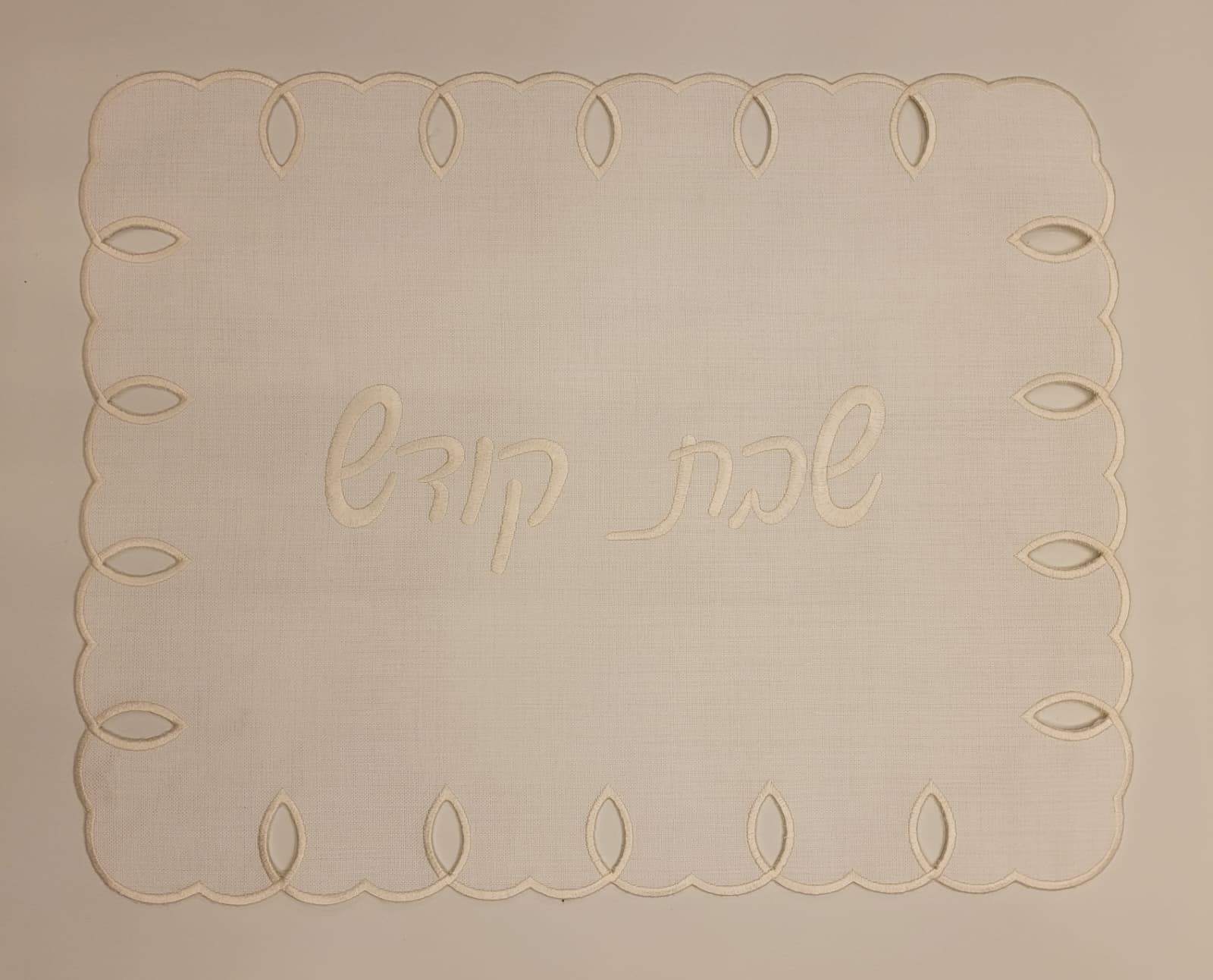 Elevate your Shabbat table with this sophisticated challah cover, crafted from premium linen-look fabric that combines durability with refined elegance. The delicate scalloped edges add a graceful finishing touch, while intricate embroidery detailing showcases artisanal craftsmanship. Perfect for weekly observance or holiday gatherings, this cover protects your challah while making a distinguished statement. The quality construction ensures lasting beauty through countless celebrations, making it an essential addition to your table linens collection.