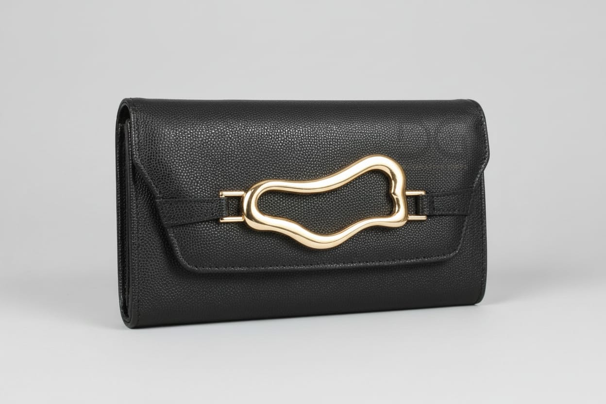 Black caviar leather evening bag with gold abstract buckle