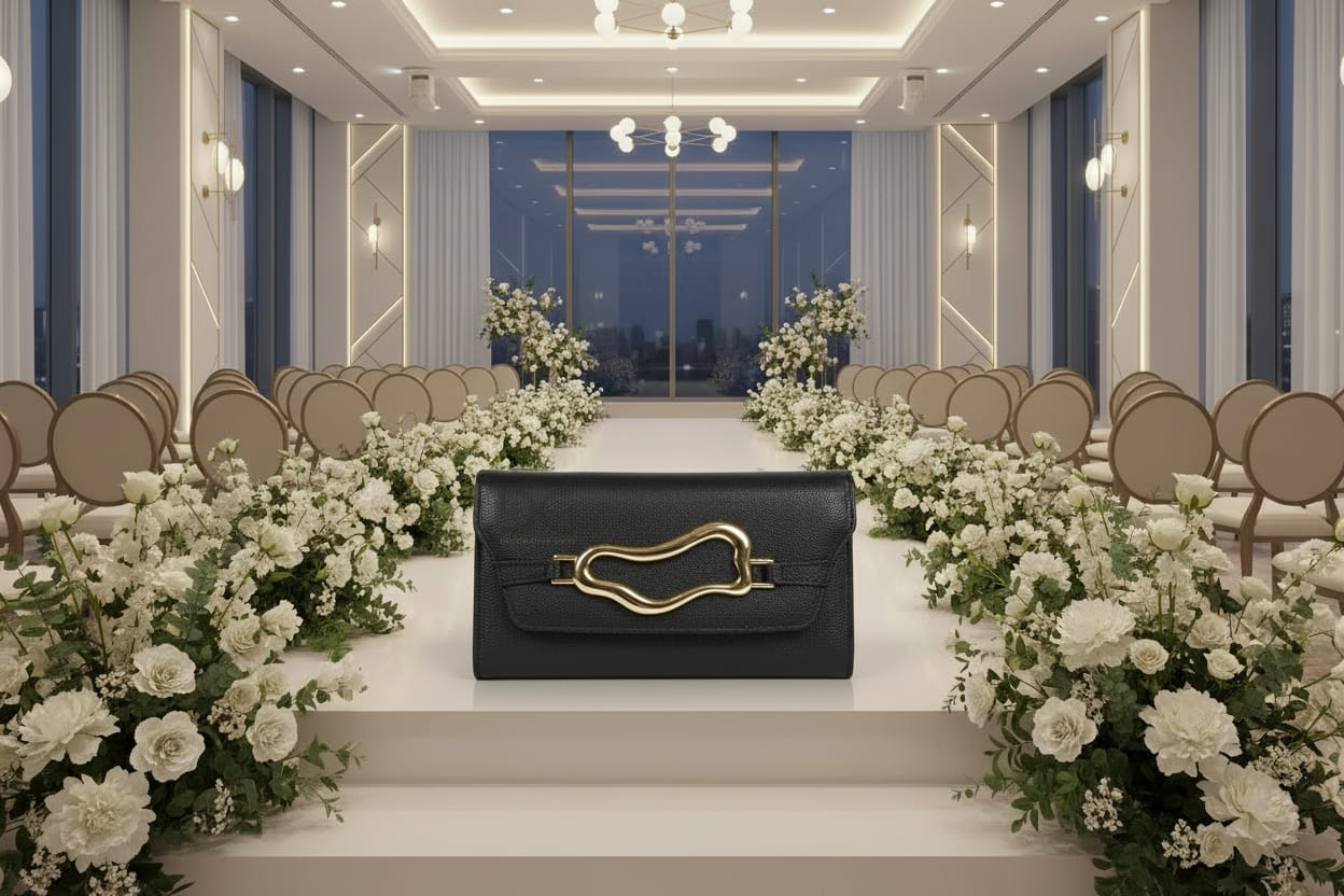 Elevate your evening ensemble with this sophisticated black caviar leather bag, crafted from luxuriously textured leather that exudes refined elegance. The striking gold abstract buckle serves as a distinctive focal point, adding contemporary flair to a timeless silhouette. Designed for versatility, this piece transitions seamlessly from formal events to upscale dinners. The included long gold chain strap offers flexible styling options—wear it crossbody for hands-free convenience or over the shoulder for classic sophistication. Perfect for the discerning individual who appreciates quality craftsmanship and understated luxury.