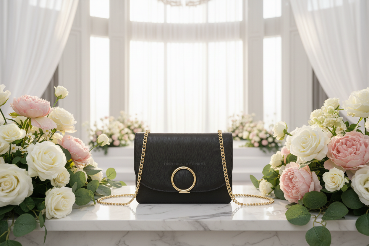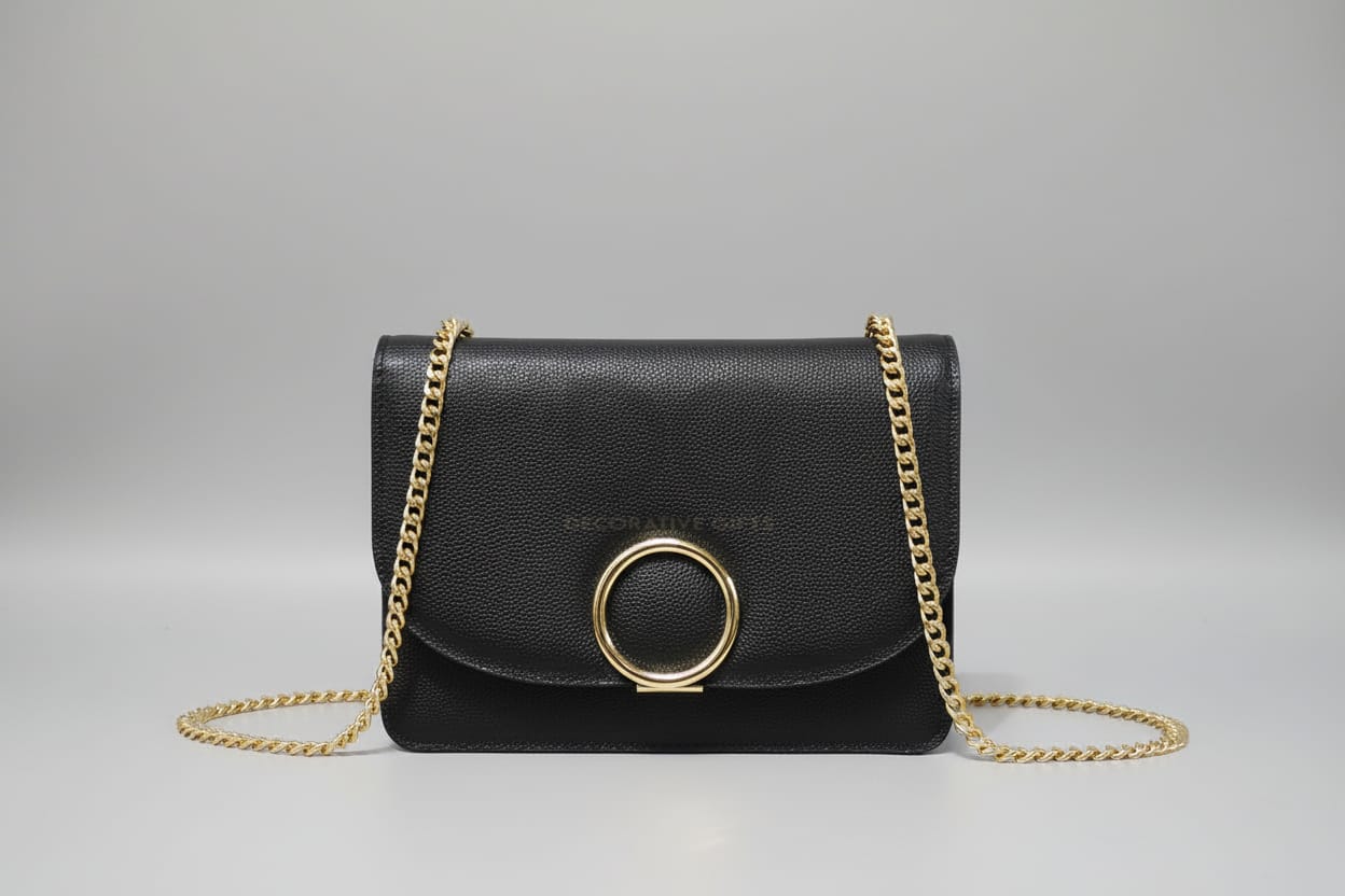Elevate your evening ensemble with this sophisticated leather bag, crafted from luxurious caviar-textured leather in classic black. The striking gold circle ornament adds refined elegance, while dual carrying options—a compact leather handle and a gold chain strap—provide versatility for any occasion. Transition seamlessly from cocktail events to formal dinners with a piece that balances timeless style with contemporary design.