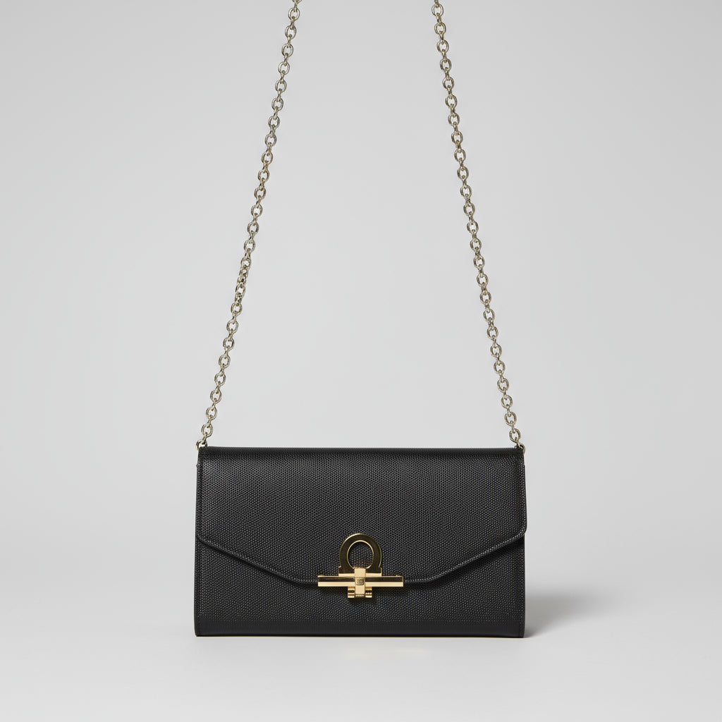 Crafted from luxurious black caviar leather, this clutch crossbody bag combines durability with sophisticated texture. Its elegant gold "a" closure adds a refined focal point, ensuring secure closure while enhancing style. Designed for versatile wear, it transitions seamlessly from day to evening, offering both functionality and timeless appeal. Perfect for carrying essentials with a touch of expert craftsmanship.