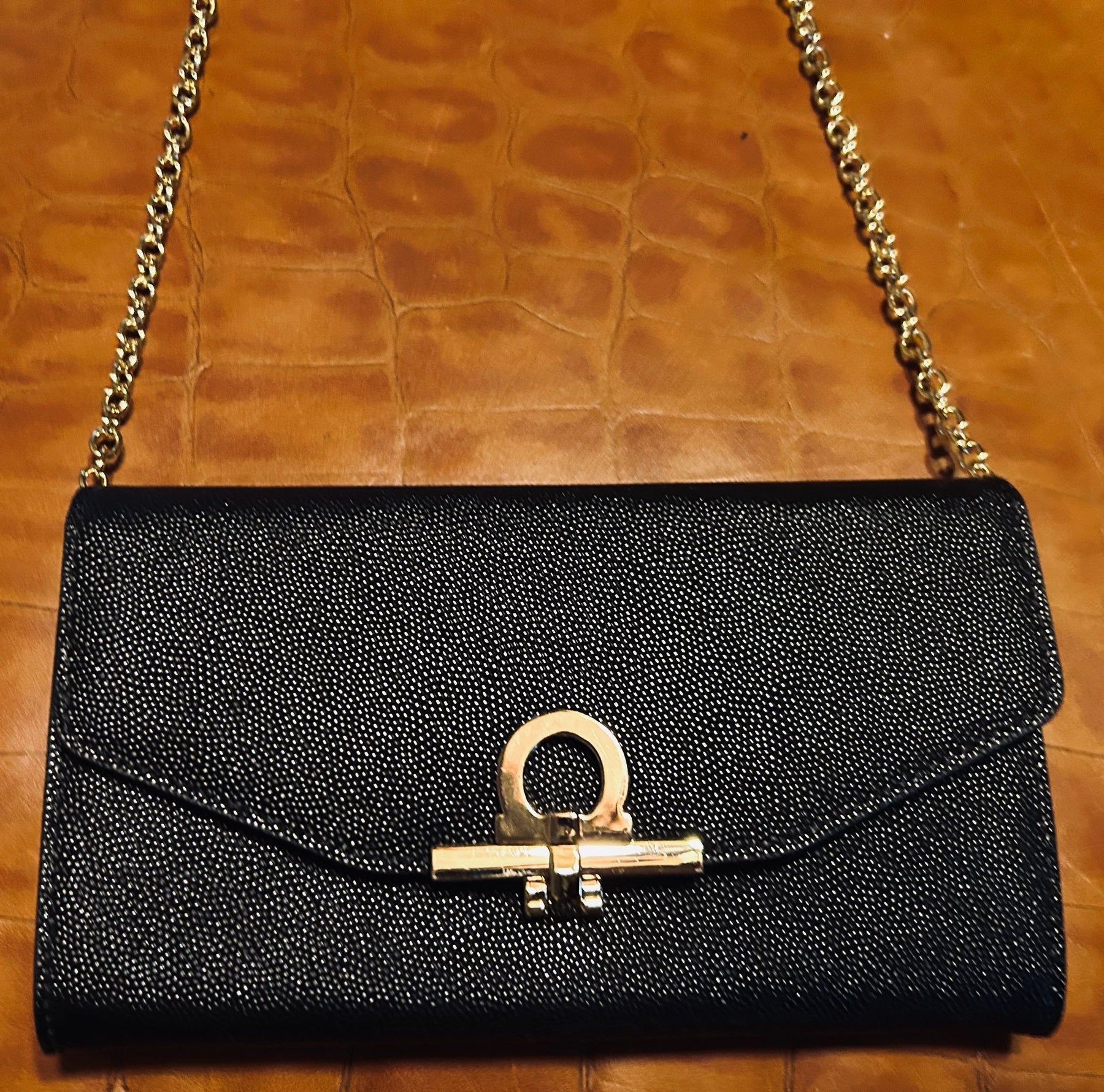 Black Caviar Leather with Gold "a" Closure Clutch Crossbody Evening Bag