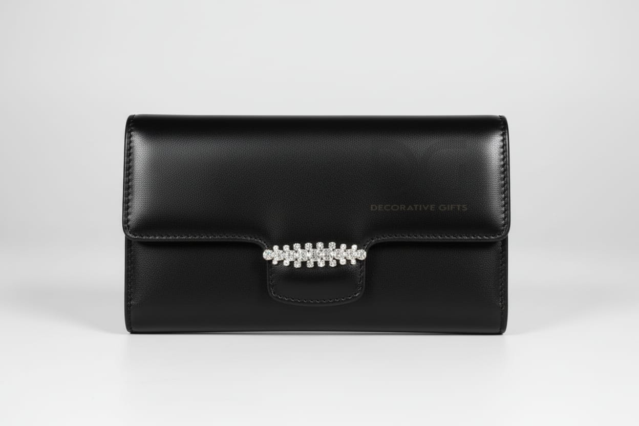 Black Smooth Leather Crossbody Evening Bag with Rhinestone Ornament