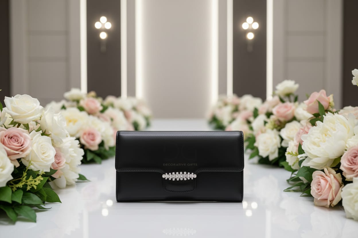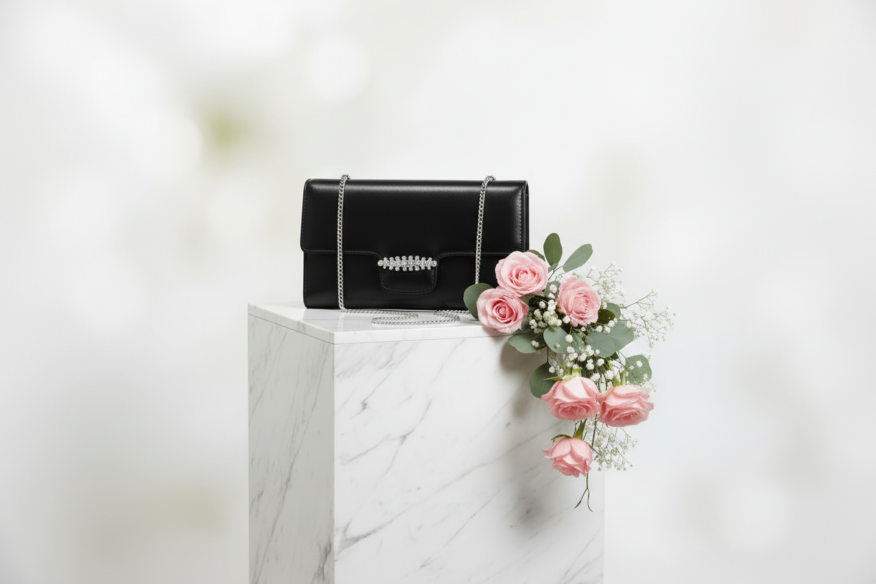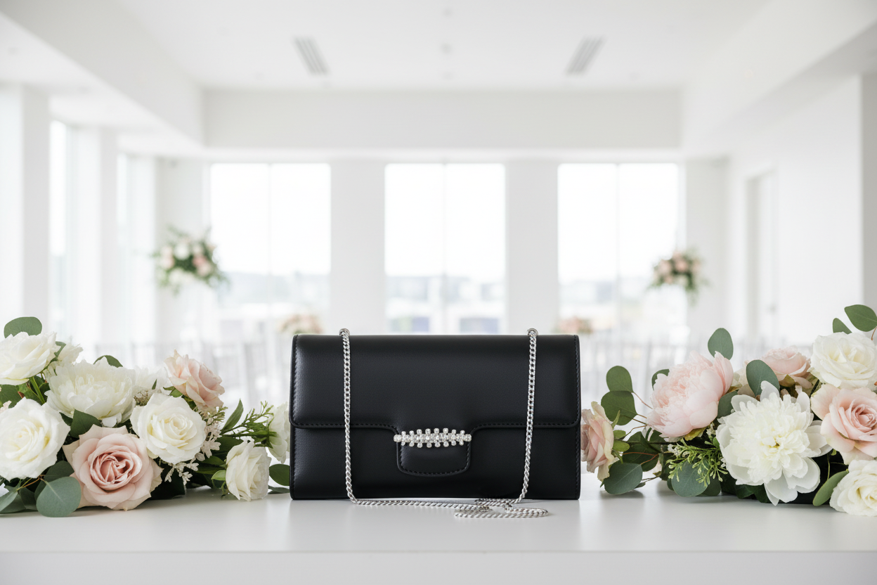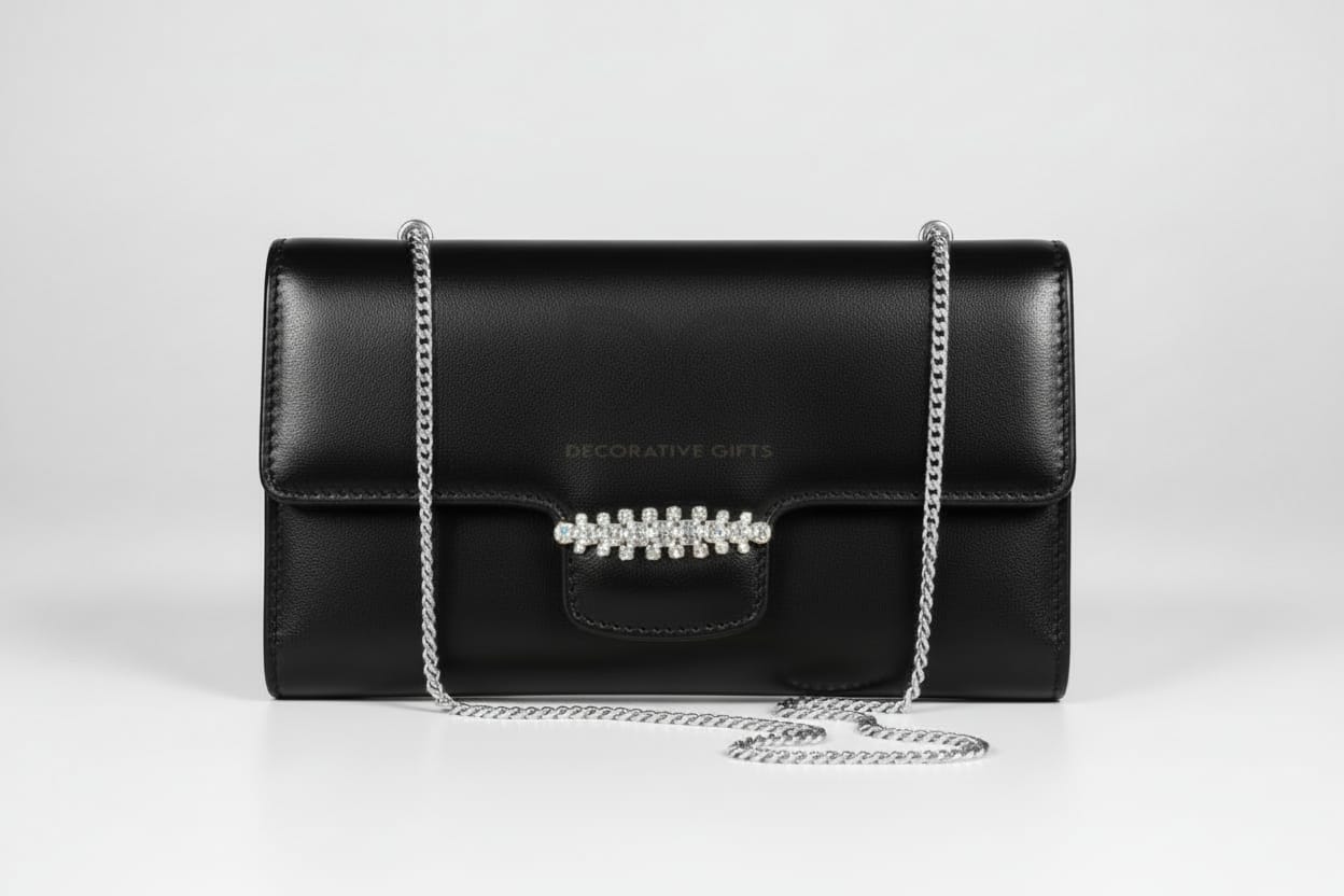 This black leather crossbody evening bag combines understated elegance with functional design. Crafted from smooth, supple leather, it features a fixed silver chain strap positioned for optimal comfort and security across the body. The rhinestone ornament on the front adds a touch of refined glamour, catching light with subtle sparkle. The structured silhouette accommodates your evening essentials—phone, wallet.—while maintaining a sleek, polished appearance. Ideal for formal events, upscale dinners, and special occasions, this versatile piece seamlessly integrates into any sophisticated wardrobe. A durable accessory that delivers both style and practicality.