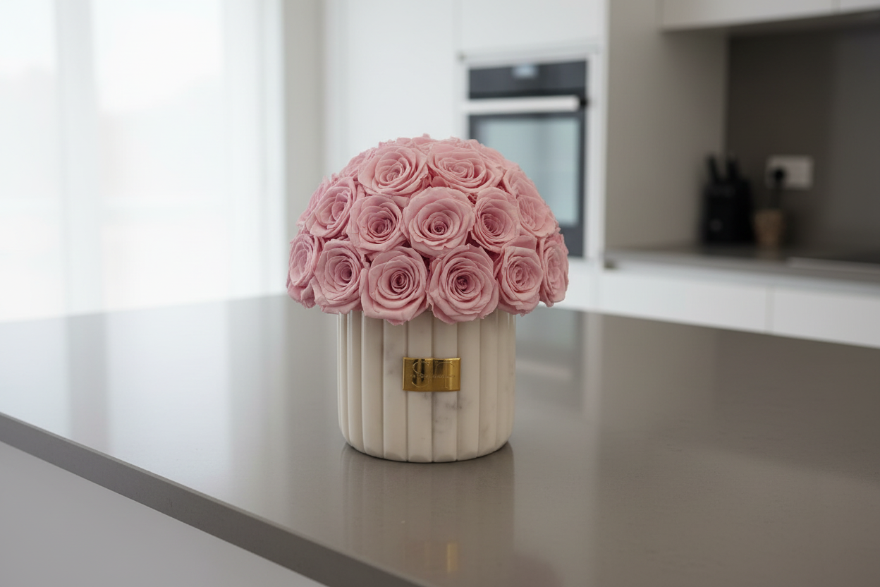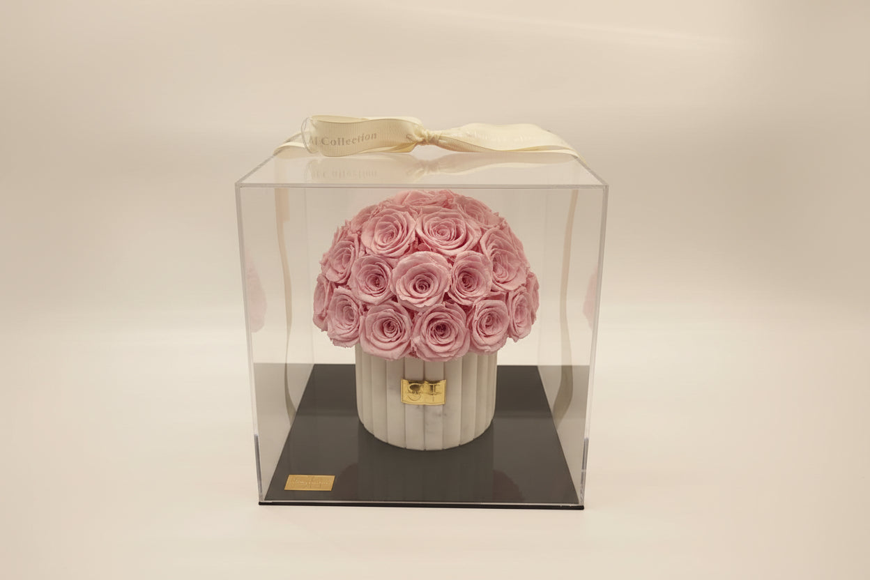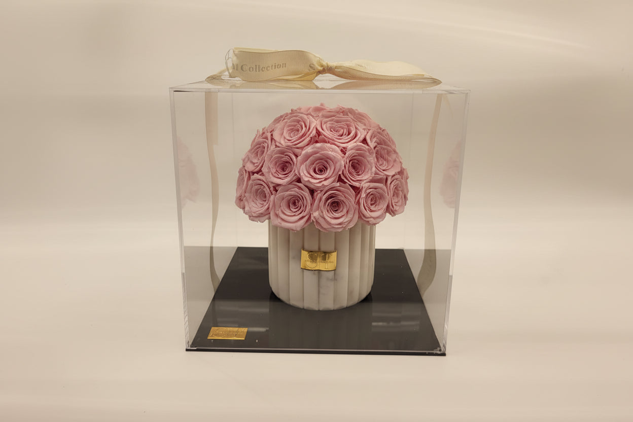 Elevate your décor with this exquisite preserved rose arrangement, featuring delicate candy pink blooms encased in a protective glass dome. Nestled in a sophisticated white fluted ceramic pot, this timeless piece combines botanical elegance with refined craftsmanship. Preserved roses maintain their natural beauty indefinitely without requiring water or maintenance, making them an ideal choice for those seeking lasting floral sophistication. Perfect as a statement centerpiece or thoughtful gift, this arrangement brings enduring charm to any interior space while celebrating the artistry of preserved floristry.