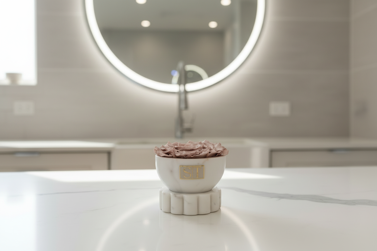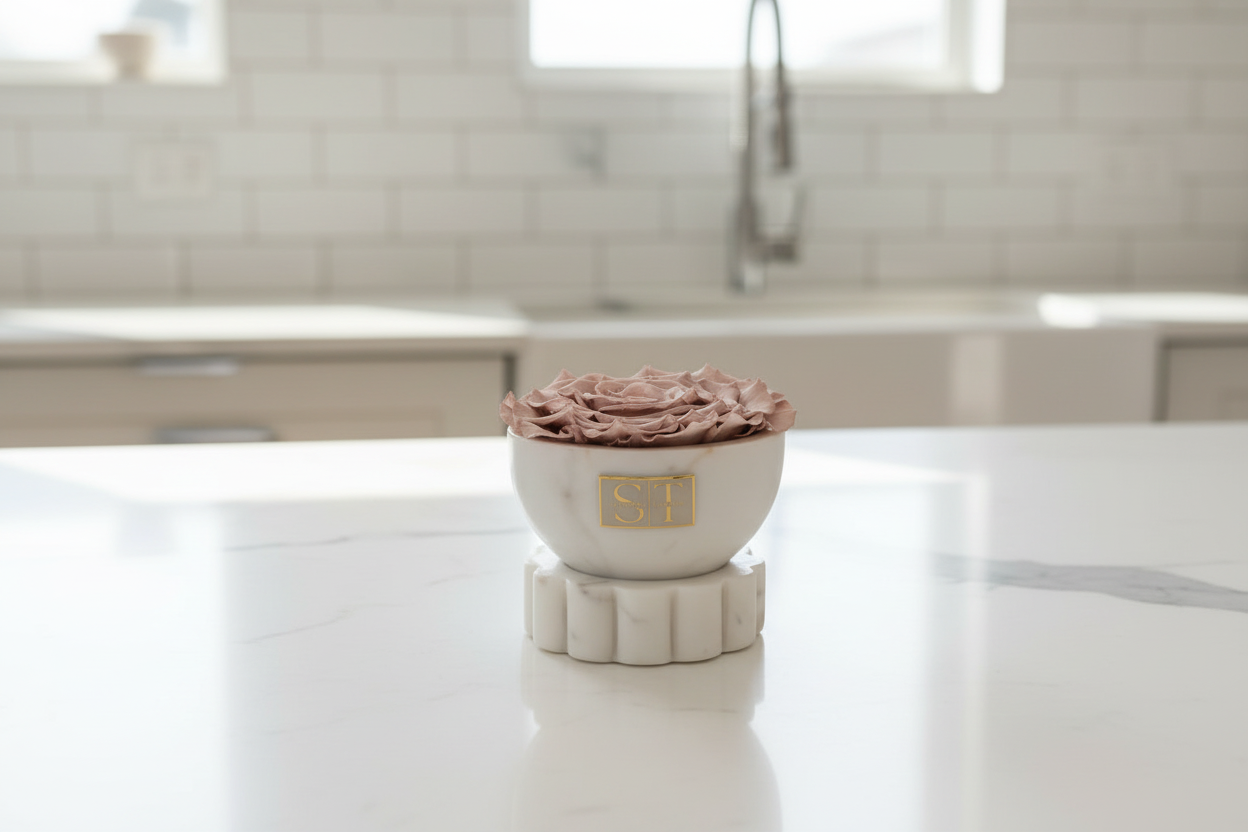Elevate your décor with this exquisite preserved rose arrangement. A single, oversized mauve bloom is meticulously preserved to maintain its natural beauty and velvety texture, requiring no water or maintenance. Nestled in an elegant white ceramic pot featuring a graceful scalloped pedestal base, this timeless piece serves as a sophisticated focal point for any room. Perfect for those seeking enduring floral elegance without the commitment of fresh flowers, this arrangement combines botanical artistry with refined design for a gift or personal treasure that lasts indefinitely.