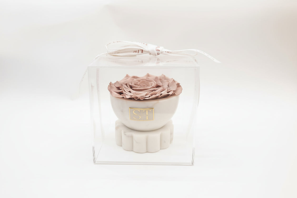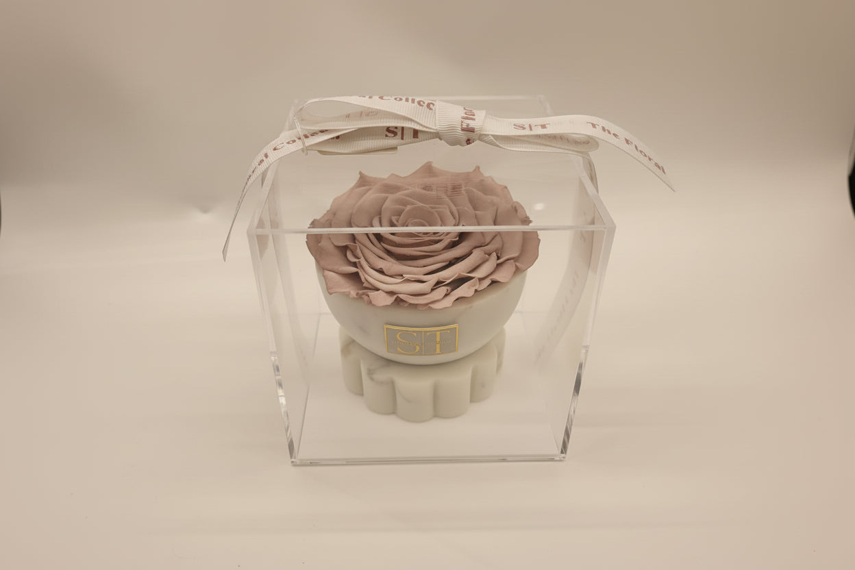 Preserved large single flat mauve rose in white round pot with scalloped pedestal
