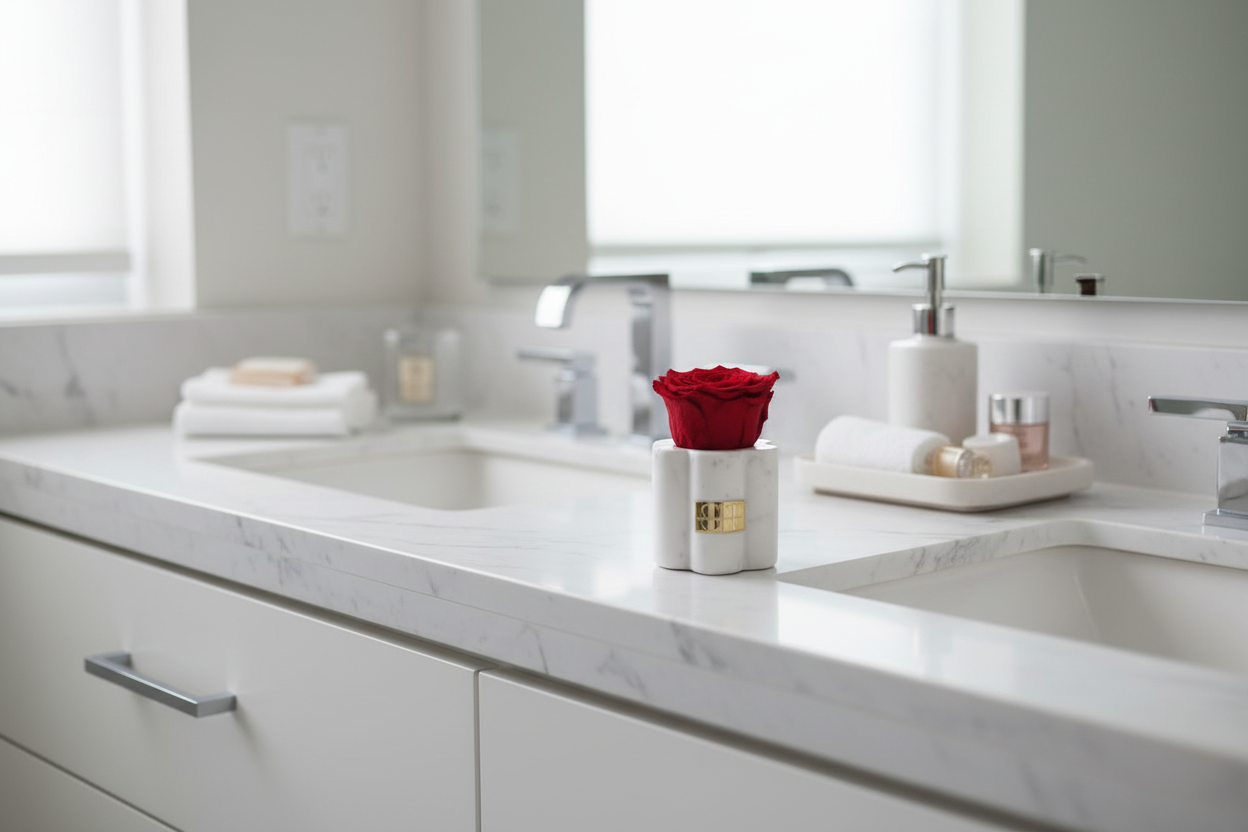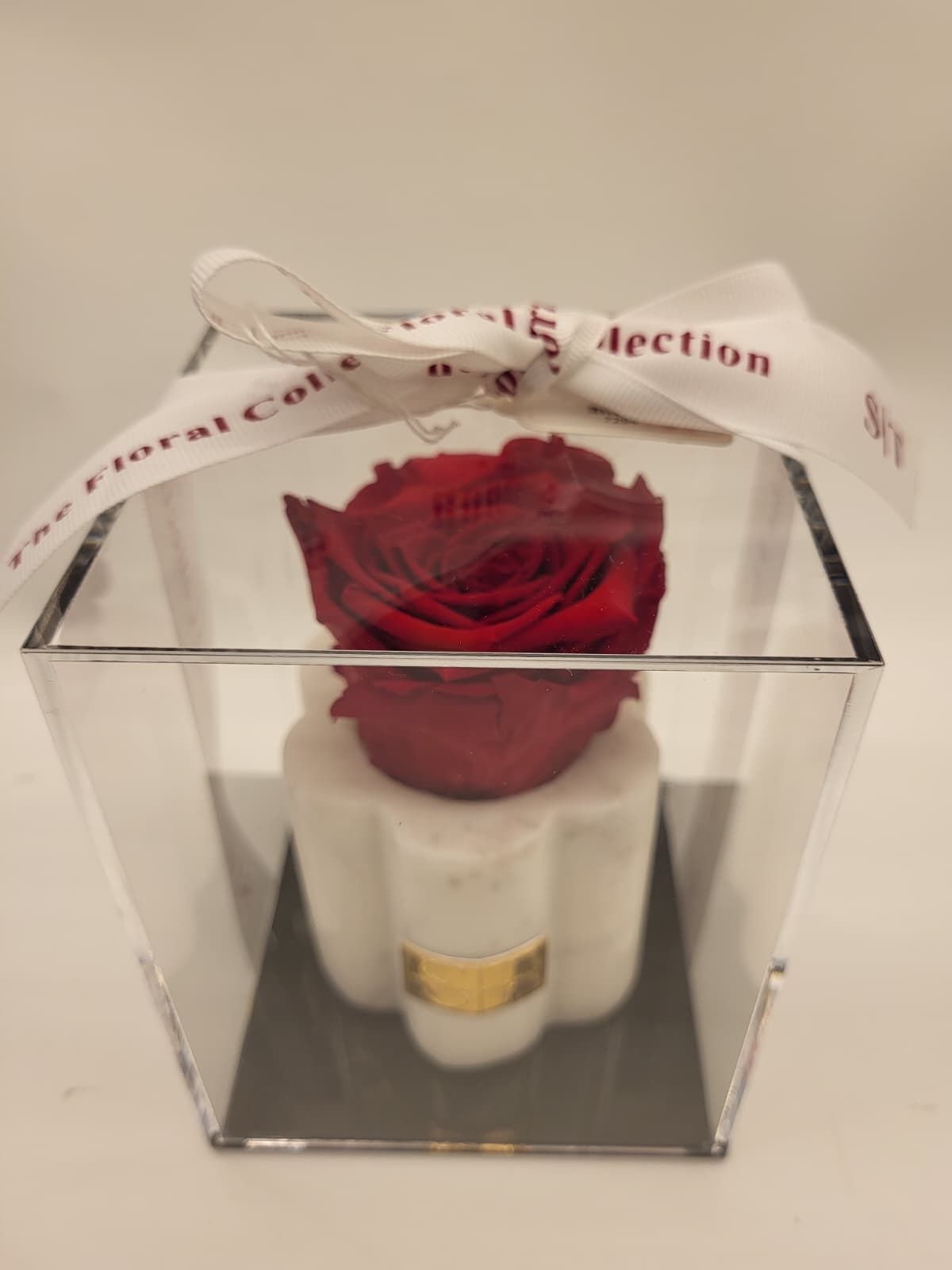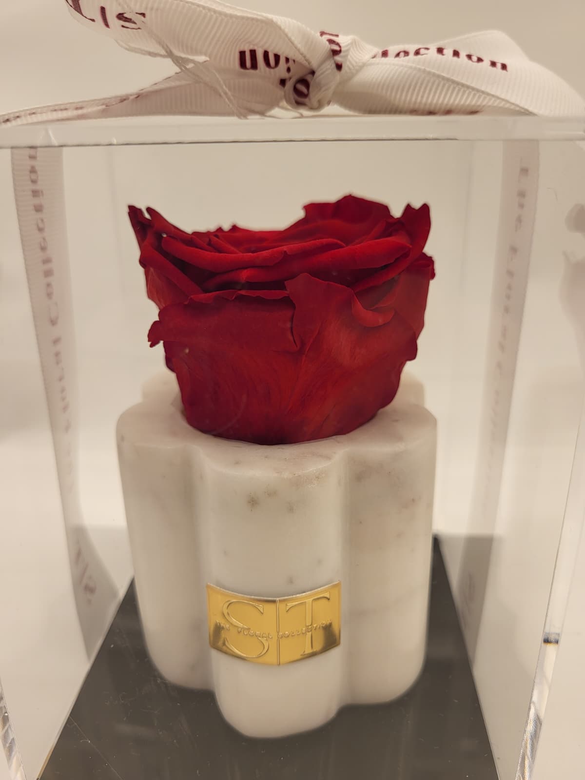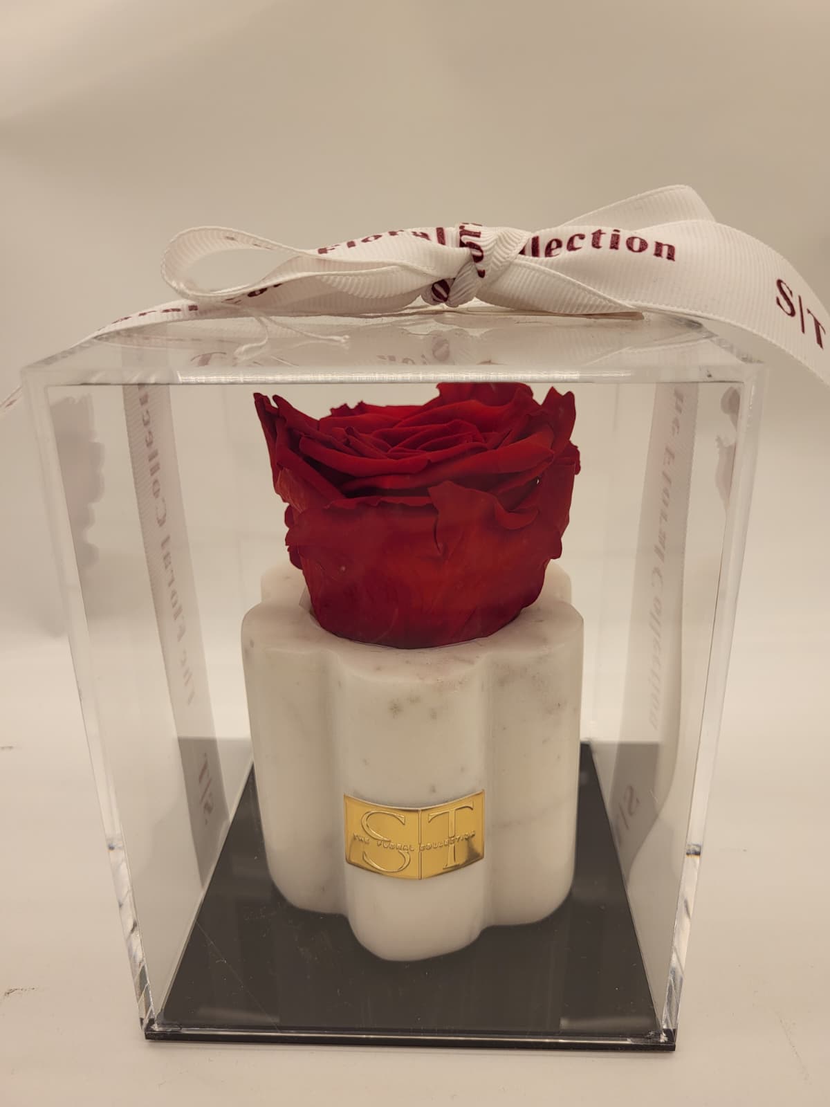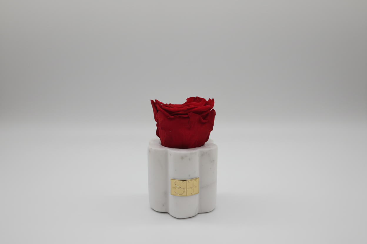 Single preserved red rose in a marble scalloped holder