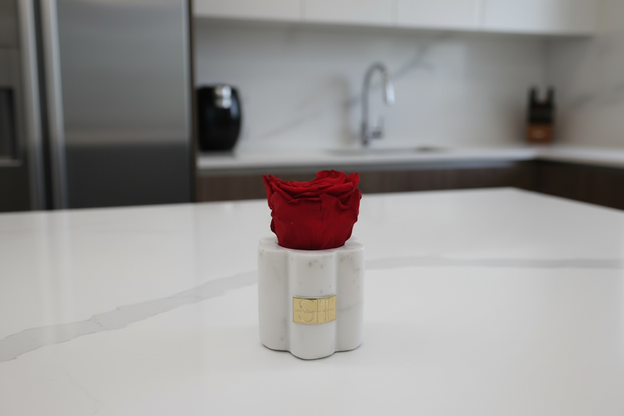 A timeless expression of elegance, this single preserved red rose showcases nature's beauty without the need for water or maintenance. Nestled in a sophisticated marble scalloped holder with refined detailing, it serves as a striking decorative accent for any space. The preservation process ensures the rose maintains its deep crimson hue and delicate form for years, making it an ideal gift for those who appreciate lasting luxury. Perfect for desks, shelves, or bedside tables, this piece combines botanical artistry with refined home décor.