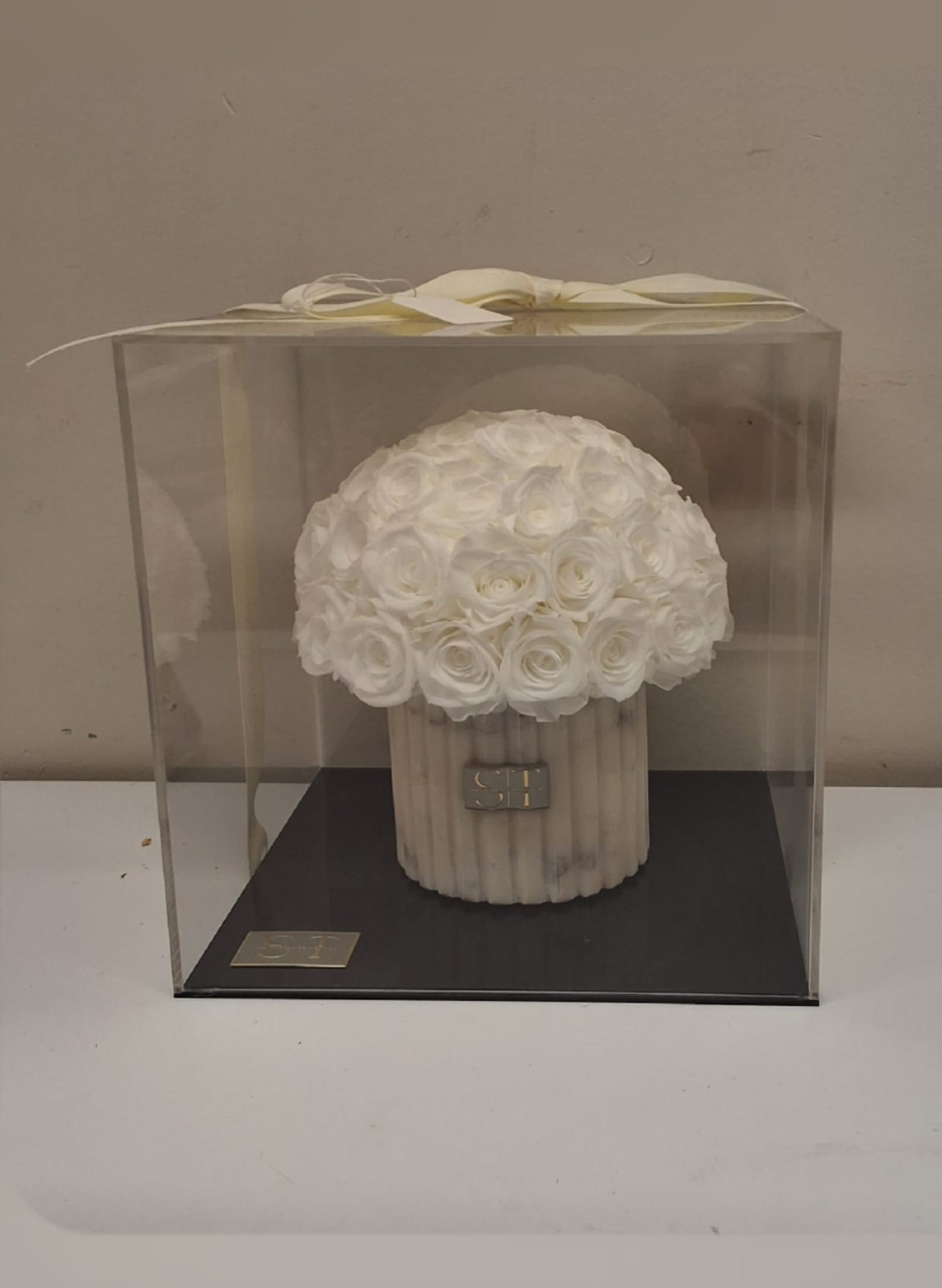 White and grey marble vase with white preserved real roses