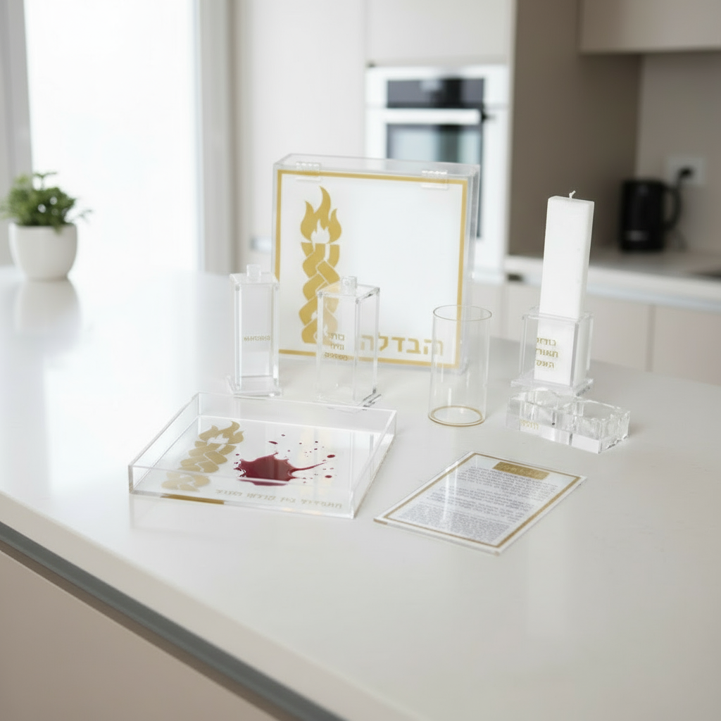 Set includes a box with Havdalah plate and cup, candle, candle holder, besomim holder, match holder tealight holder, and Havdalah card.
