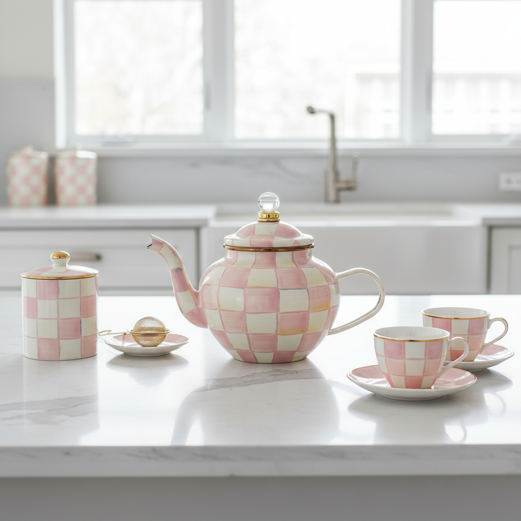 You won’t be able to resist our Rosy Check 4 Cup Teapot, short and stout indeed. Hand-painted enameled steel shaped into the most adorable little form imaginable: Sized just right for English Breakfast in the morning with the newspaper, Earl Grey in the afternoon with a baked treat, or chamomile in the evening with the book you just can’t put down. Enough for two, or plenty for you.